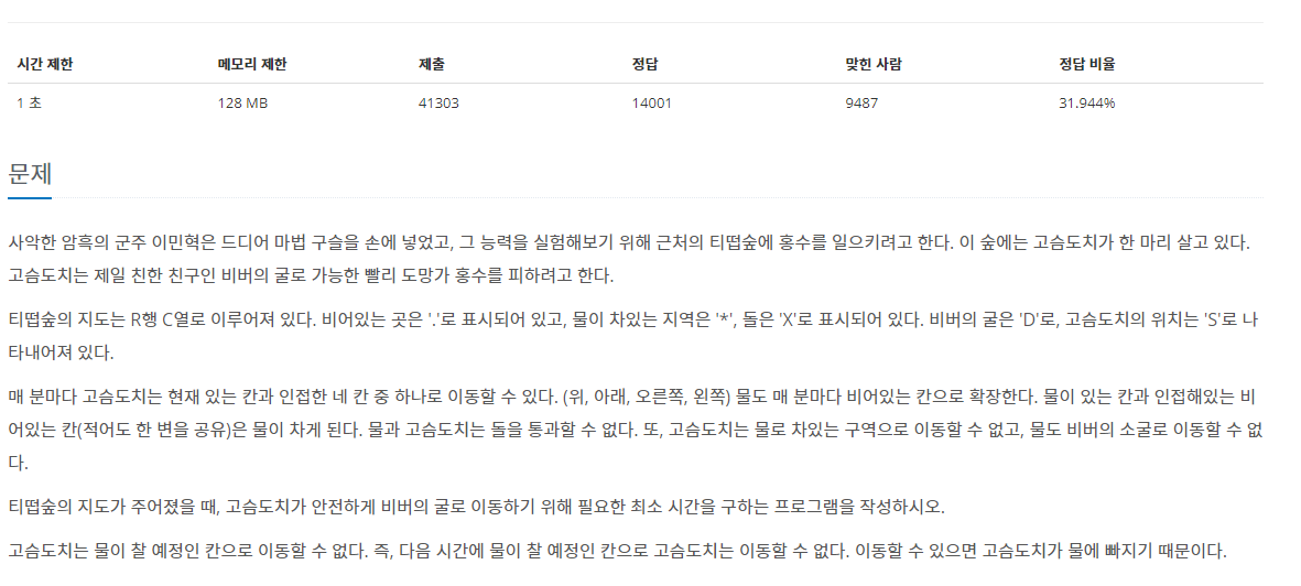 도착점을 제외하고는 고슴도치는 물이 찰 예정인 칸으로 갈 수 없으므로 목표좌표에 고슴도치부터 이동시키고 물과 고슴도치가 만난다면 물로 표시했다
