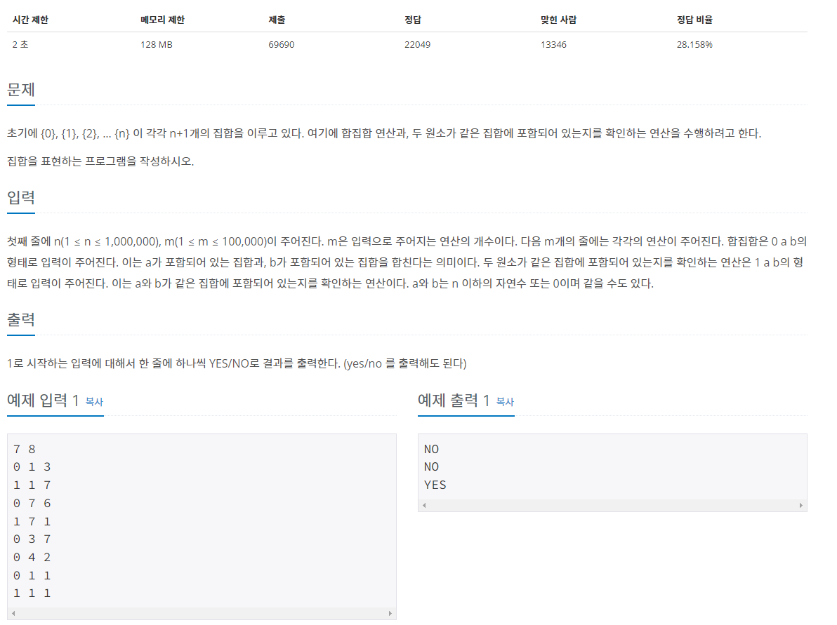 같은 집합에 포함되어있는지 확인하려고 할 때 x와 y가 같은 보스를 가지고 있는지 확인하면 되기 때문에 유니온 파인드를 이용해서 풀었다