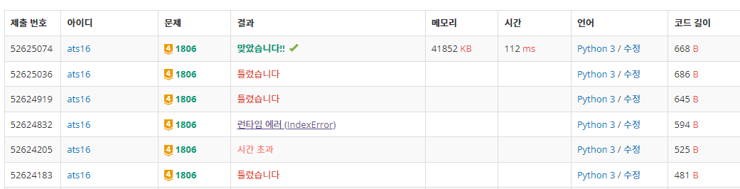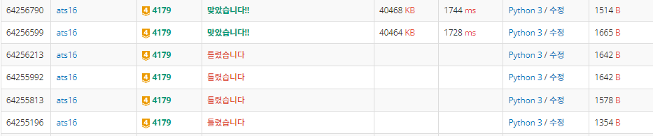 bfs 함수에 들어가기전 if문 조건에 오타가 있었다. if arr[0][i] == 1: 로 잘못 입력했었는데도 채점이 50%이상 진행되어서 이쪽 부분을 다시 볼 생각을 못했다.