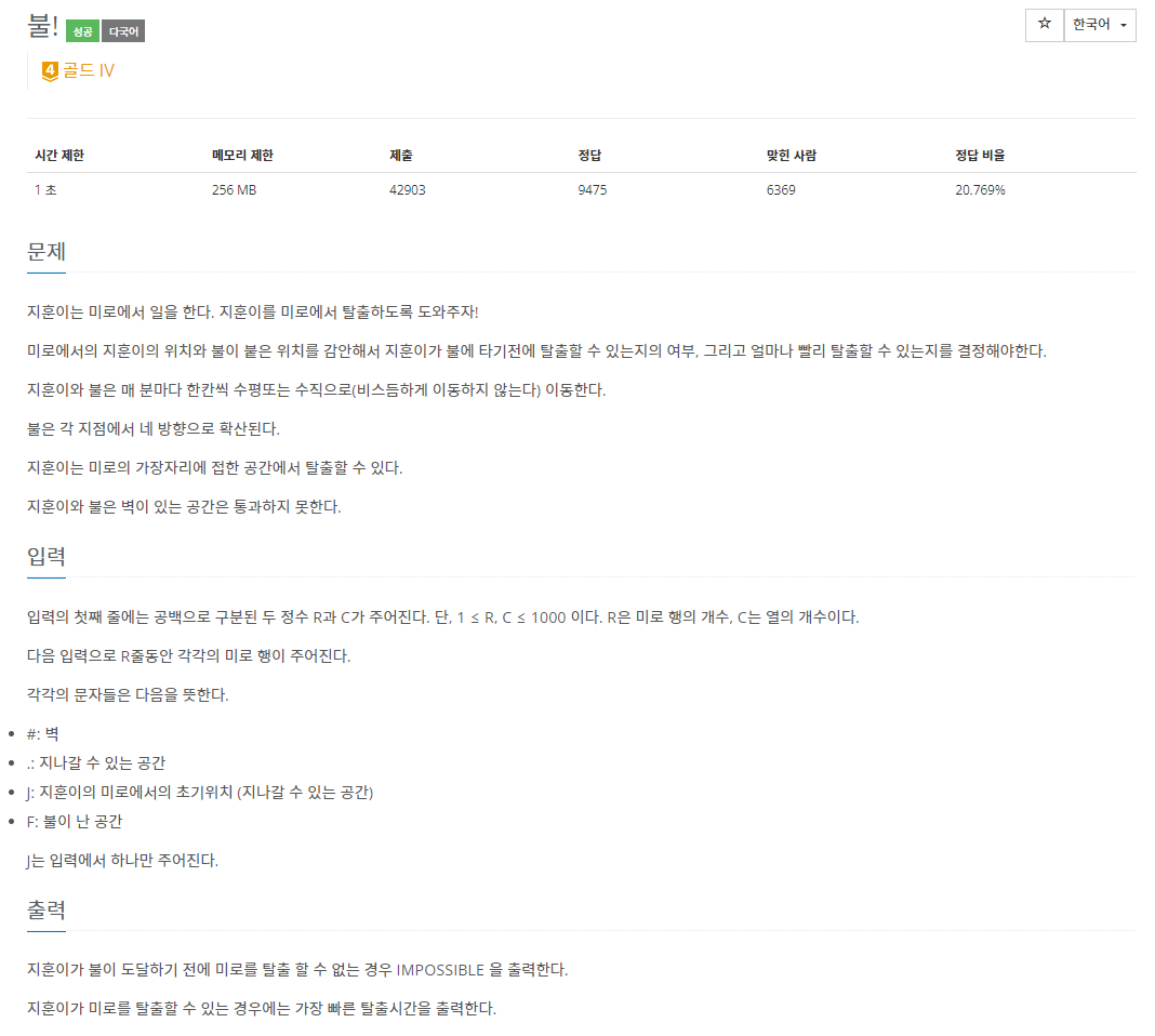 elif arr[dy][dx] == 'F' or arr[y][x] != 'F': # 현재 위치가 불이 아니면(지훈이) 갈 곳이 없으므로 패스하고, 가야할 위치가 지점이 불이라면 탐색하지않음(중복탐색방지)